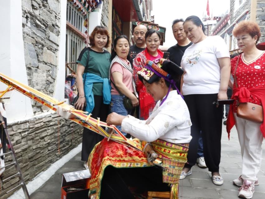 在理縣古爾溝鎮(zhèn)丘地村,54歲的藏族阿媽澤朗斯基端坐家門前,動(dòng)作嫻熟地操作著傳統(tǒng)腰機(jī),編織一款藏式花腰帶。只見(jiàn)她靈巧的雙手來(lái)回推拉木梭,不時(shí)變換著經(jīng)線,不一會(huì)兒,五彩的絲線就化為明艷動(dòng)人的吉祥紋樣,在織布上綻放開(kāi)來(lái)。