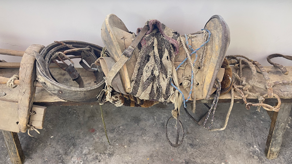 圖為五里村村史館展覽的過去運(yùn)輸貨物和生活必需品上山的馬駝?dòng)镁?。新華網(wǎng) 陳穎 攝