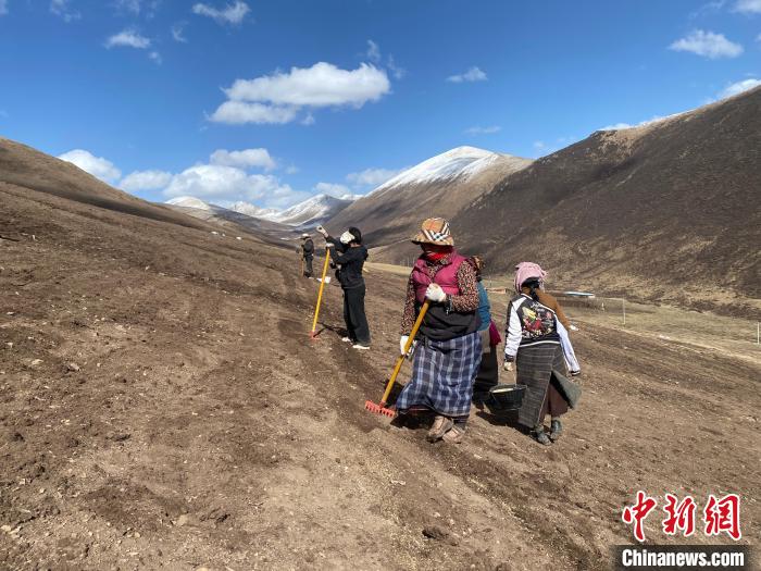“土壤、植物和動(dòng)物共同組成了完整的‘地球肌膚’系統(tǒng),恢復(fù)黑土灘需要針對(duì)不同生態(tài)層次進(jìn)行科學(xué)治理。”彭奎介紹,本次修復(fù)在今年四月進(jìn)行,首先針對(duì)土壤進(jìn)行淺刨溝、坡向垂直橫向條播,為播種創(chuàng)造合適的土壤條件,再選用披堿草、老芒麥、中華羊茅、冷地早熟禾、星星草、燕麥、紫羊茅7種本地草種,進(jìn)行比例混合,再為種子覆土,以有利于保持種子不被風(fēng)吹、流失和鳥(niǎo)類(lèi)“偷吃”,穩(wěn)定恢復(fù)植被生長(zhǎng)。