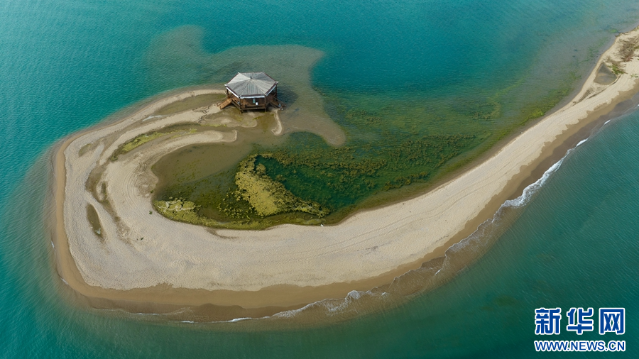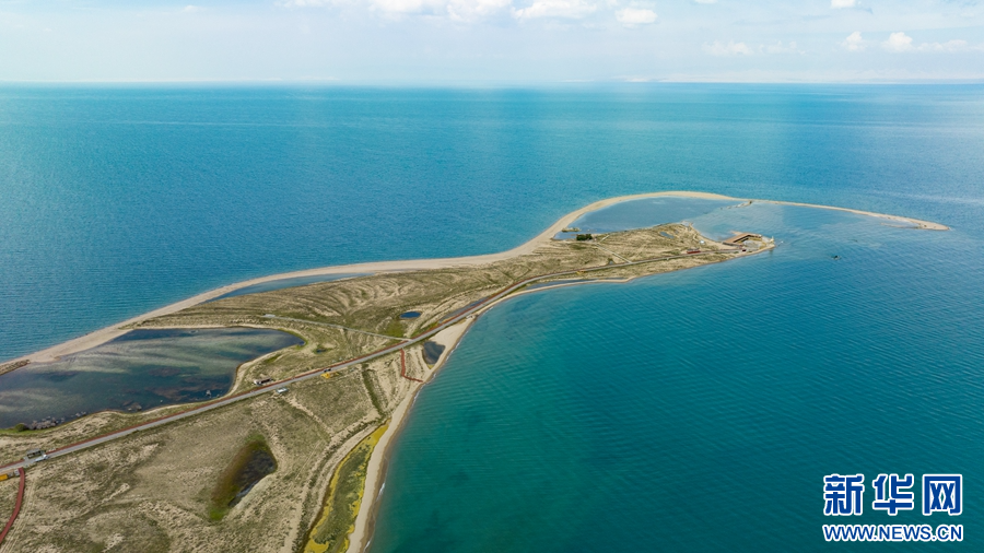 這是8月2日拍攝的青海湖二郎劍景區(qū)二郎劍半島。(無人機(jī)照片)新華網(wǎng) 郭勇良 攝