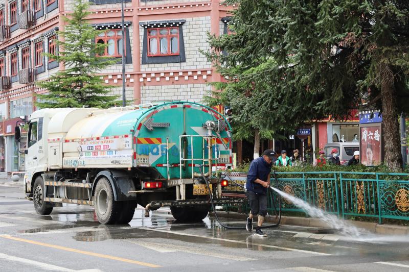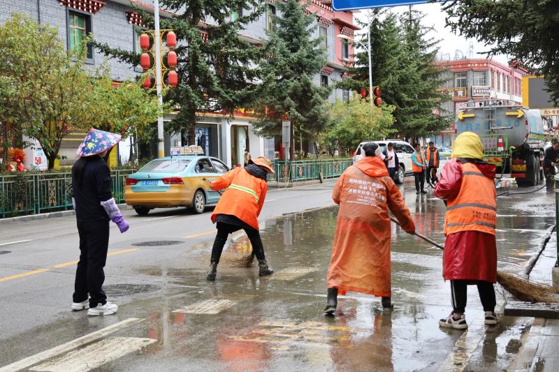 為盡快恢復(fù)城區(qū)潔凈容貌,香格里拉市和祥環(huán)??萍加邢挢?zé)任公司立即組織環(huán)衛(wèi)工人30名,抽調(diào)高壓水車(chē)2輛、掃地車(chē)4輛,積極開(kāi)展道路清淤工作,同時(shí)對(duì)下水道水口周邊的樹(shù)枝、雜物等進(jìn)行清理清運(yùn)。經(jīng)過(guò)近五小時(shí)的連續(xù)作業(yè),成功恢復(fù)道路暢通整潔。