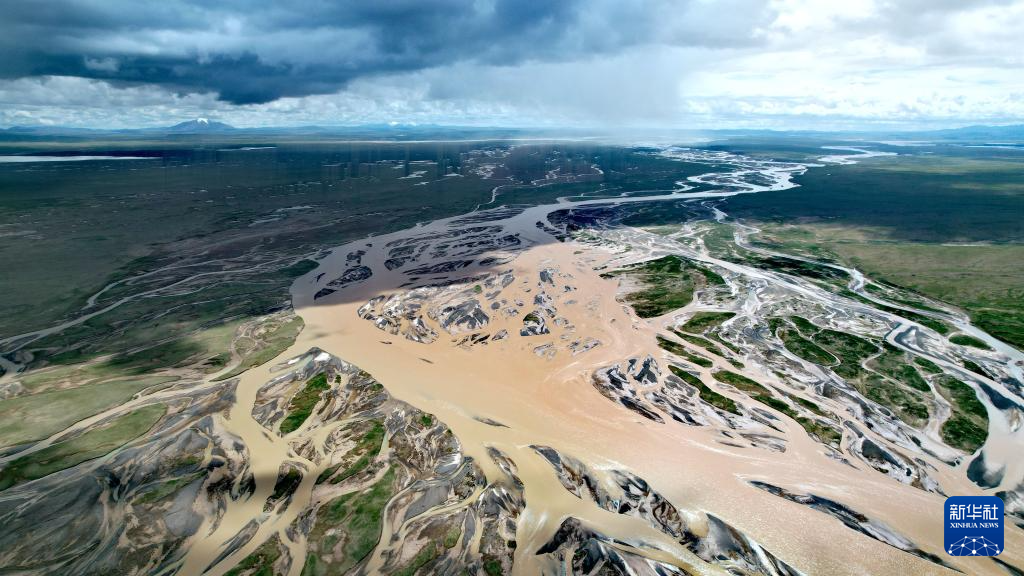 沱沱河與當(dāng)曲匯合處的囊極巴隴,辮狀河道寬度超過3千米(無人機照片)。新華社記者 劉詩平 攝