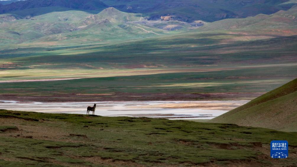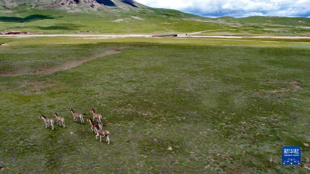 通天河支流辮狀河道旁的藏野驢(7月26日攝,無人機(jī)照片)。新華社記者 劉詩平 攝