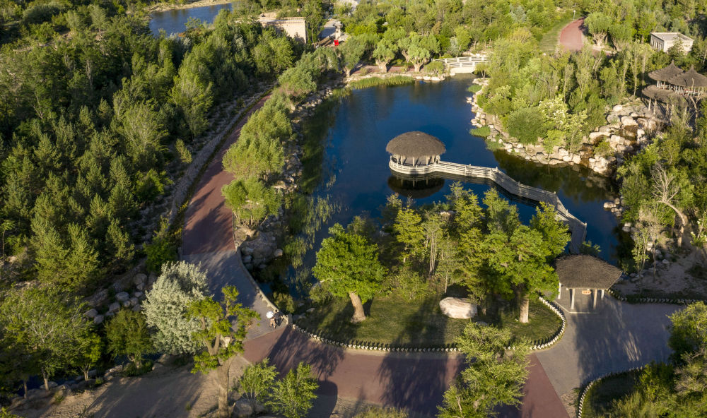 坐落在寧夏銀川市賀蘭山腳下的賀蘭山運(yùn)動(dòng)休閑公園(2021年5月27日攝,無(wú)人機(jī)照片)。這里曾是一片砂石采礦塌陷區(qū),當(dāng)?shù)赝ㄟ^(guò)植被景觀再造、水系建設(shè)、現(xiàn)代管網(wǎng)鋪建等手段,重新利用廢石、廢坑及各類廢棄建筑材料,把這里變成一座免費(fèi)開(kāi)放的主題公園。新華社記者 馮開(kāi)華 攝