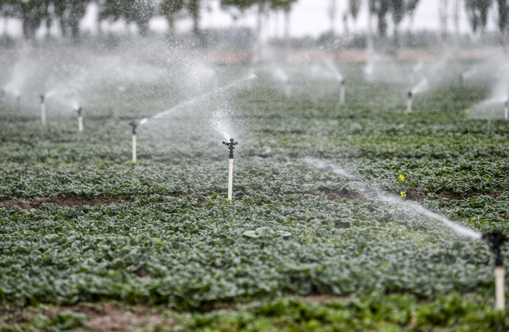 2023年5月25日,在寧夏銀川市永寧縣望洪鎮(zhèn)宋澄村冷涼蔬菜種植基地,小型噴灌節(jié)水設(shè)備在進(jìn)行噴灌作業(yè)。新華社記者 馮開(kāi)華 攝
