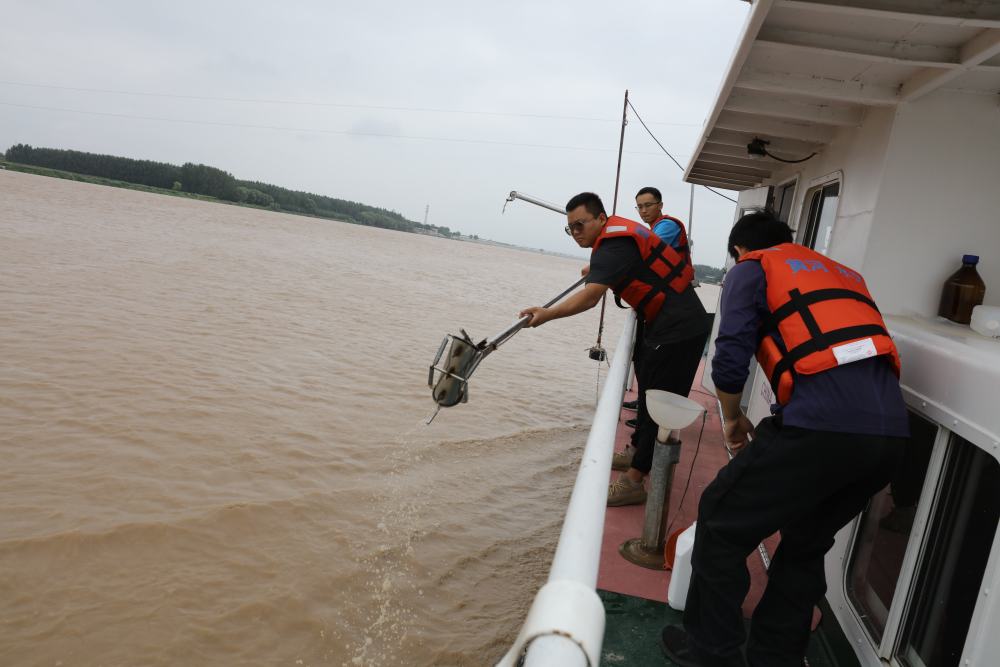 2023年6月29日,調(diào)水調(diào)沙期間,黃河下游利津水文站工作人員在進(jìn)行取沙作業(yè)。新華社記者 劉詩(shī)平 攝