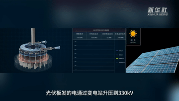 光伏板發(fā)的電通過變電站升壓到330KV,經(jīng)過50多公里長的高壓輸電線路輸送到龍羊峽水電站,水電站再根據(jù)總的發(fā)電任務和光伏實時發(fā)電量調(diào)節(jié)水電,實現(xiàn)“削峰填谷”,最終并網(wǎng)向外輸送。