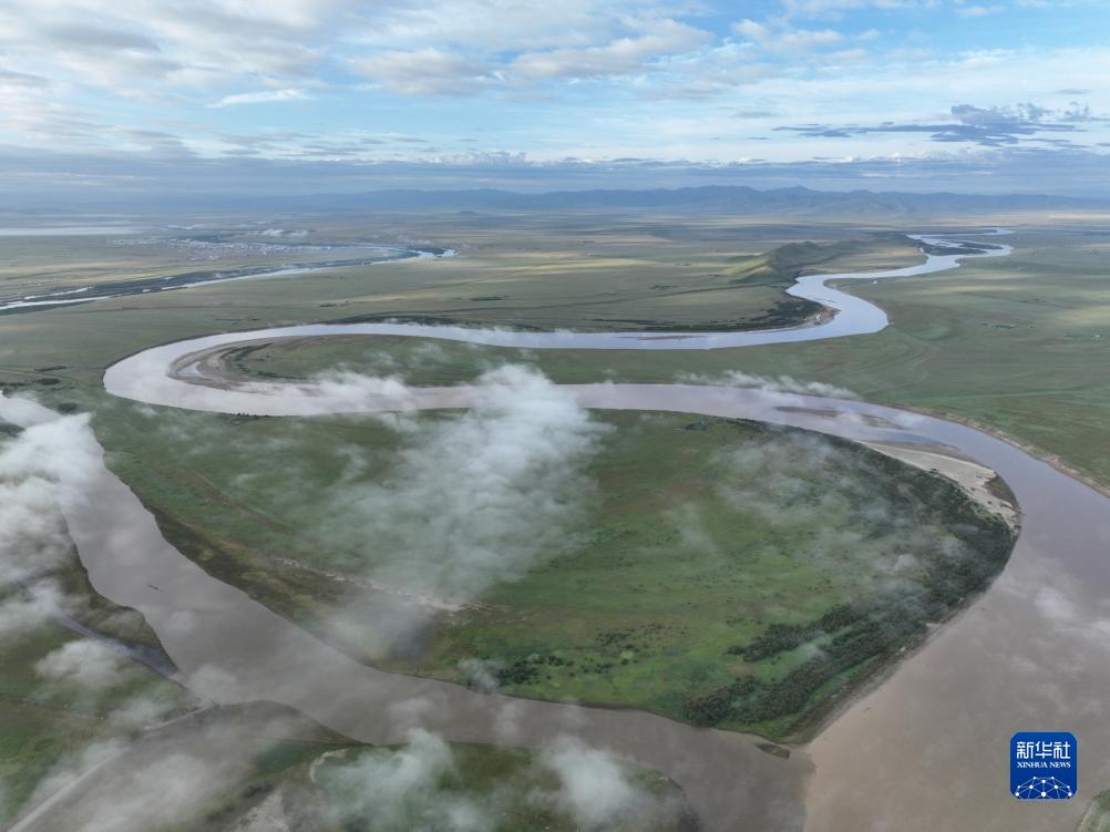這是8月22日清晨在四川省阿壩藏族羌族自治州若爾蓋縣唐克鎮(zhèn)拍攝的黃河九曲第一灣景色(無人機照片)。新華社記者 王曦 攝