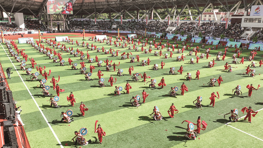 來自四川省藏文學(xué)校的小伙們熱情奔放、姑娘們可愛生姿,由他們共同演繹的這支青春動感熱身操,瞬時點燃體育場氣氛,9000余雙眼睛注視著全場刮起的這輪“最炫民族風(fēng)”,觀眾席掌聲雷動、歡呼聲響徹。