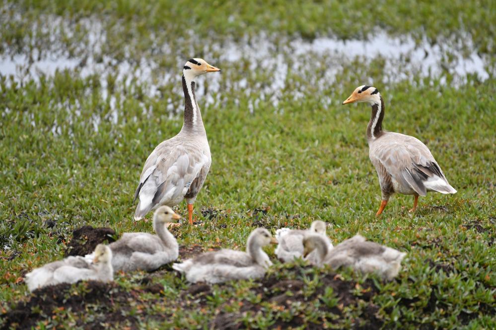 斑頭雁幼鳥在甘肅尕海則岔國家級自然保護(hù)區(qū)的尕海濕地嬉戲。 新華社記者 陳斌 攝