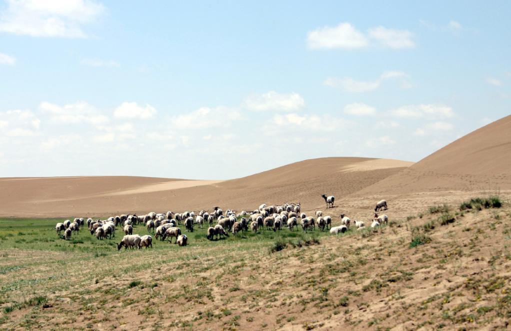 2004年7月19日,羊群在瑪曲縣一處沙化退化的草場(chǎng)上吃草,背后是大片流動(dòng)沙丘。新華社記者 宋常青 攝