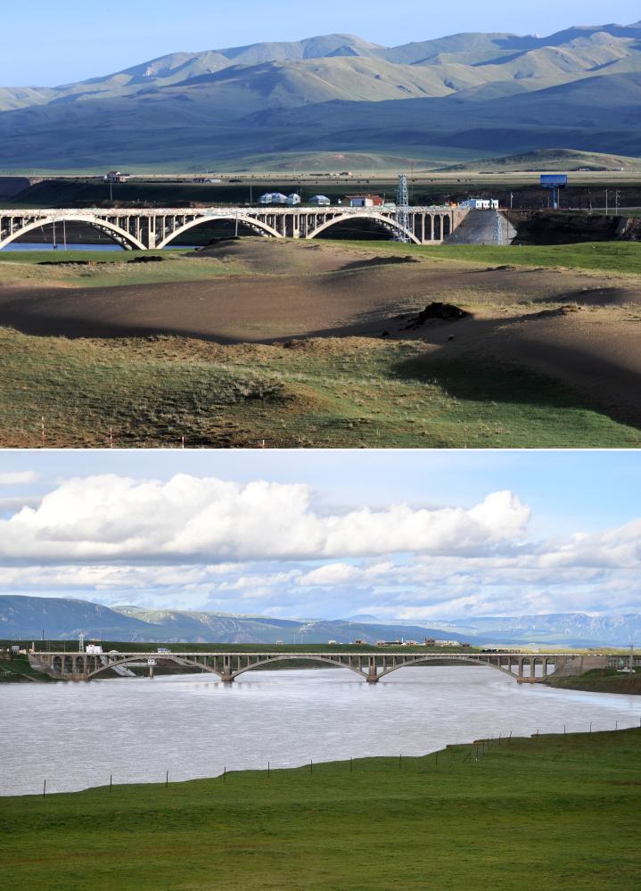 拼版照片:上圖為2011年6月10日在甘南藏族自治州瑪曲縣城郊的黃河大橋附近拍攝的大面積沙化退化草場(chǎng)(新華社記者 聶建江 攝);下圖為2023年7月6日在甘南藏族自治州瑪曲縣城郊的黃河大橋附近拍攝的沙化退化草場(chǎng)已經(jīng)復(fù)綠(新華社記者 陳斌 攝)。