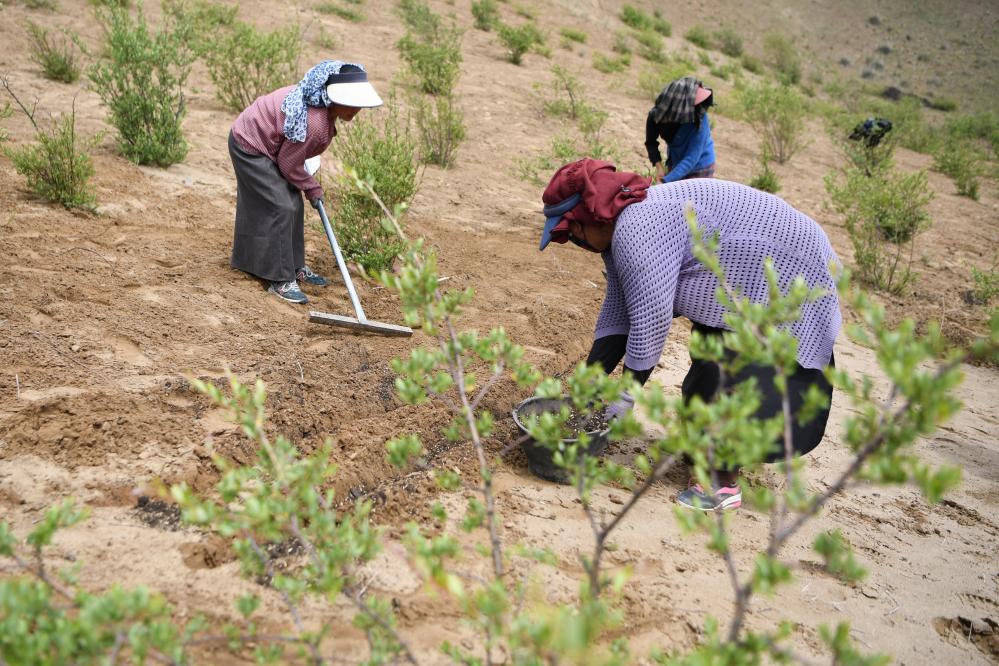 牧民在瑪曲縣歐拉鎮(zhèn)黃河沿岸一處沙化草原治理點(diǎn)補(bǔ)種草籽(7月6日攝)。新華社記者 方欣 攝