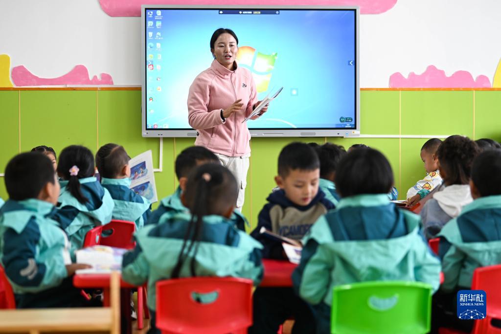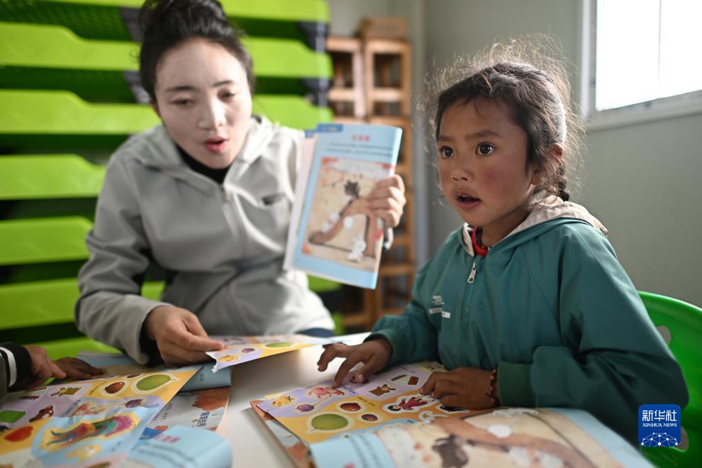 在青海省玉樹(shù)藏族自治州曲麻萊縣秋智鄉(xiāng)布甫村陽(yáng)光幼兒園,秋智鄉(xiāng)幼兒園副園長(zhǎng)才仁戰(zhàn)斗(右二)在課堂上和小朋友互動(dòng)(9月14日攝)。新華社記者 張宏祥 攝
