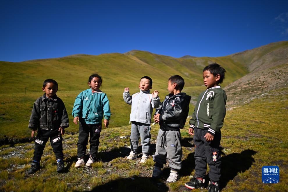 在青海省玉樹(shù)藏族自治州曲麻萊縣秋智鄉(xiāng)布甫村陽(yáng)光幼兒園,普松東周(左二)和伙伴們?cè)诮淌覂?nèi)玩耍(9月14日攝)。新華社記者 韓方方 攝