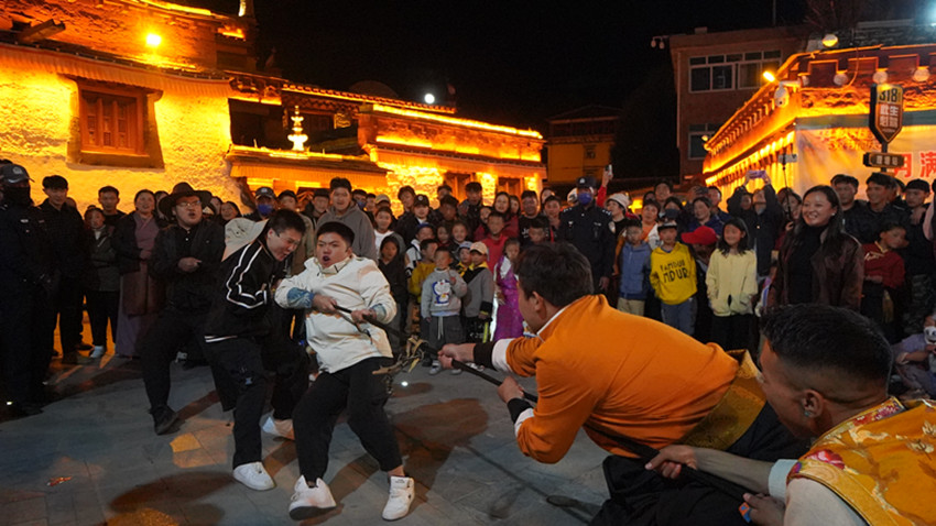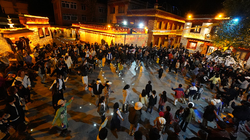 “加油、加油……”10月1日晚,在仁康小廣場(chǎng)上,遠(yuǎn)道而來(lái)的各地游客與理塘當(dāng)?shù)鼐用袢罕姸汲两诿袼谆顒?dòng)的歡樂(lè)節(jié)日氛圍中?,F(xiàn)場(chǎng)邀請(qǐng)游客進(jìn)行的三人拔河比賽,掀起了活動(dòng)高潮?!斑@里的氛圍讓我感到很舒服,也祝祖國(guó)母親生日快樂(lè)。”來(lái)自陜西西安的游客黃家樂(lè)說(shuō)。伴隨著各族群眾手拉手跳起的鍋莊舞,游客和群眾深切感受到民族大團(tuán)結(jié)的溫暖。