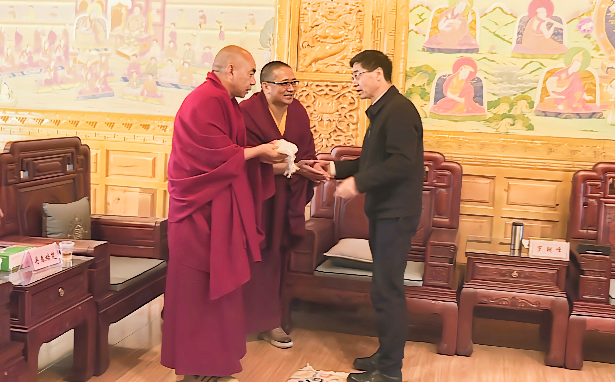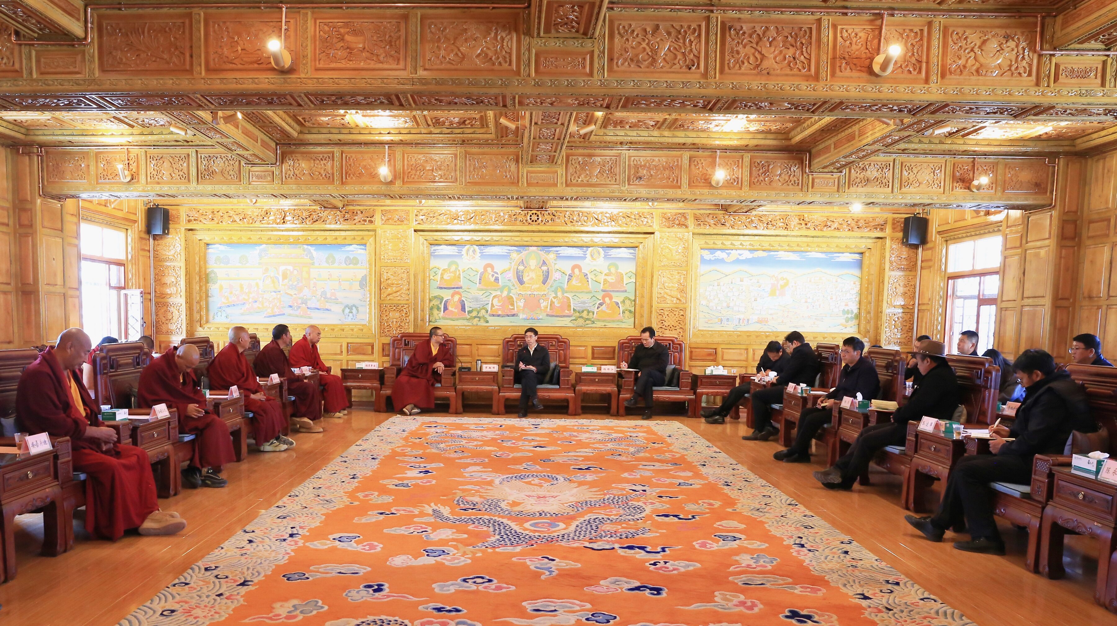 在松贊林寺,羅朝峰與宗教界代表人士深入交流座談,詳細了解僧人學修、生活等情況,面對面傾聽他們的心聲、訴求,引導僧人們從多年來國家面貌、人民生活發(fā)生的變化,松贊林寺基礎(chǔ)設(shè)施、僧人修行條件的變化中憶苦思甜,感念黨恩。希望他們珍惜和諧穩(wěn)定的大好局面和良好的修行生活條件,深入踐行習近平總書記提出的“政治上靠得住、宗教上有造詣、品德上能服眾、關(guān)鍵時起作用”政治要求,繼承和發(fā)揚愛國愛教的優(yōu)良傳統(tǒng),進一步鑄牢中華民族共同體意識。