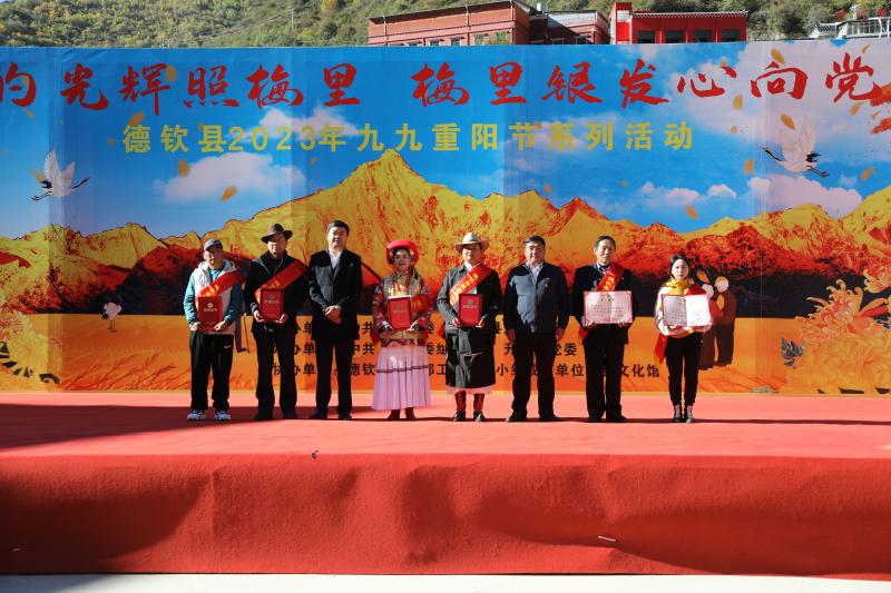 活動中,德欽縣縣委、政府負責人分別為2023年德欽縣“黨的光輝照梅里 梅里銀發(fā)心向黨”重陽節(jié)系列慶?;顒又罗o,并通報了德欽縣2023年經濟社會發(fā)展情況。