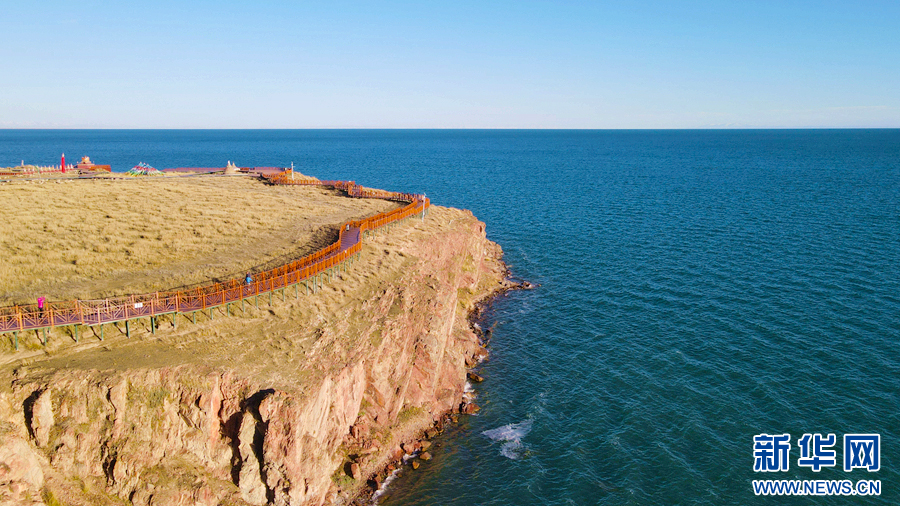 圖為青海湖圣泉灣秋景(無人機(jī)照片)。新華網(wǎng) 卡婭梅朵 攝