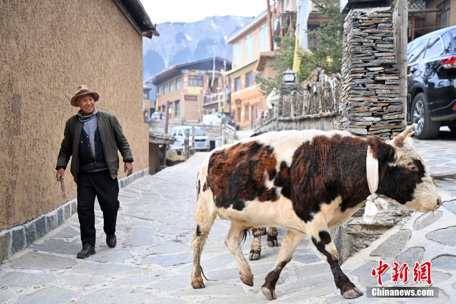 11月3日,甘肅省甘南藏族自治州迭部縣,扎尕那村民在外出放牛。中新社記者 九美旦增 攝