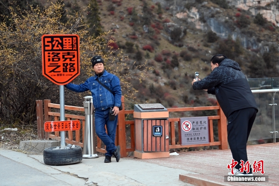 11月3日,甘肅省甘南藏族自治州迭部縣,游客在扎尕那景區(qū)拍照留念。中新社記者 九美旦增 攝