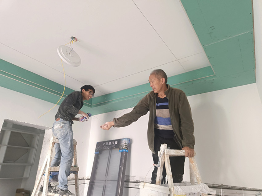 奎武村民李德華協(xié)助工人正在客廳忙著畫石膏線,得知記者來(lái)訪,李德華難掩激動(dòng),迫不及待地帶著記者參觀他的新家。