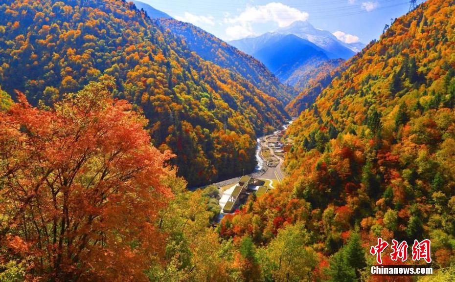 深秋時(shí)節(jié),四川省阿壩州小金縣瑪嘉溝迎來(lái)一年中最美季節(jié),雪山、冰川、海子、針葉林、原始森林等在藍(lán)天白云下變得色彩斑斕,層林盡染,已是一幅半山彩林半山雪的壯觀景象。陳邦亮 攝