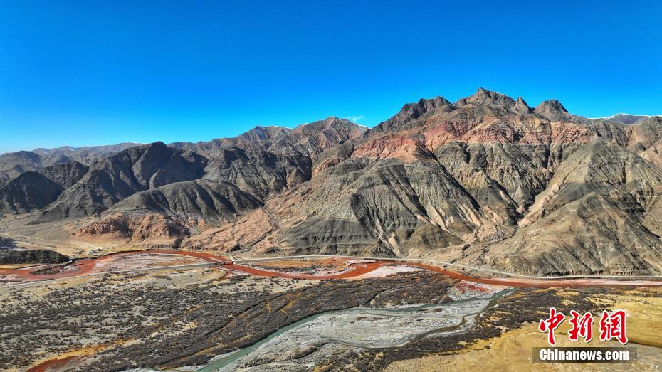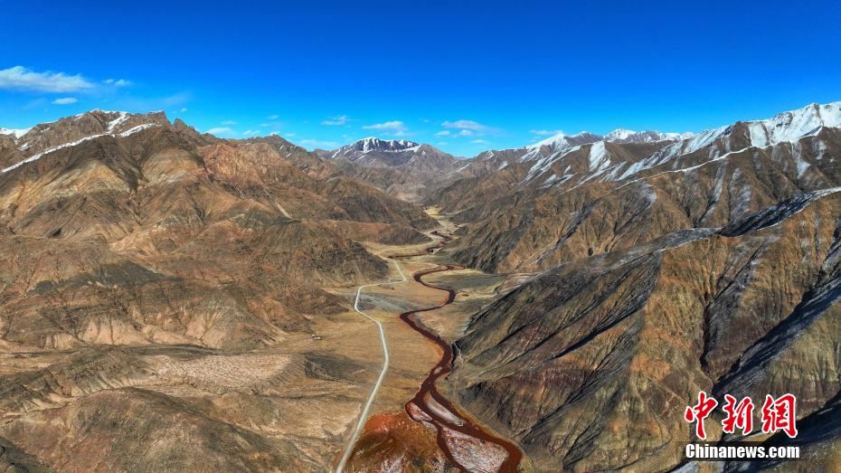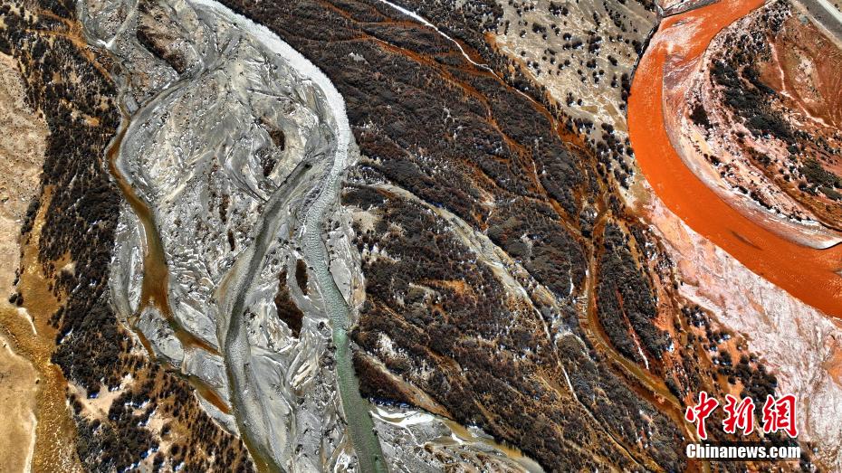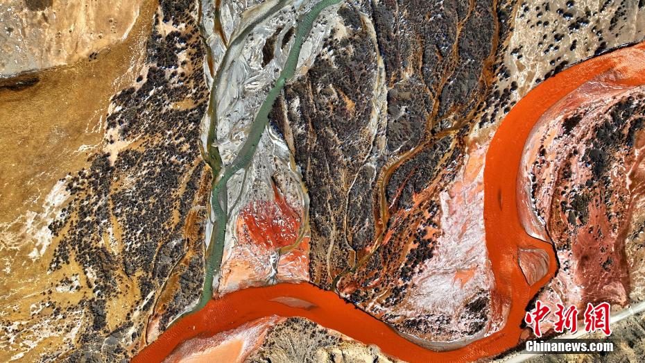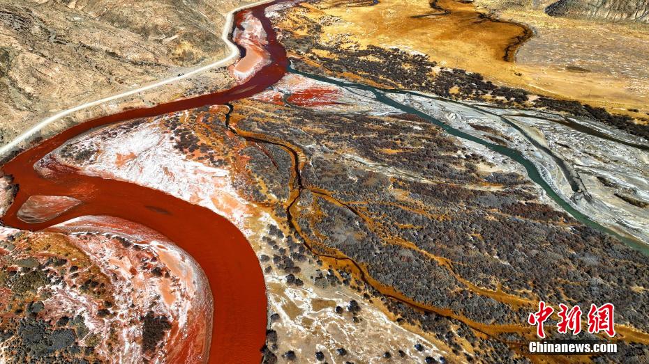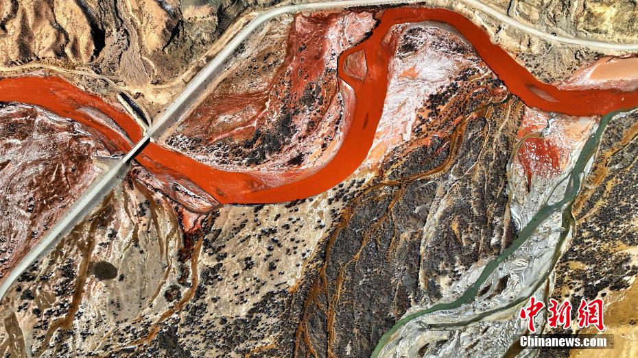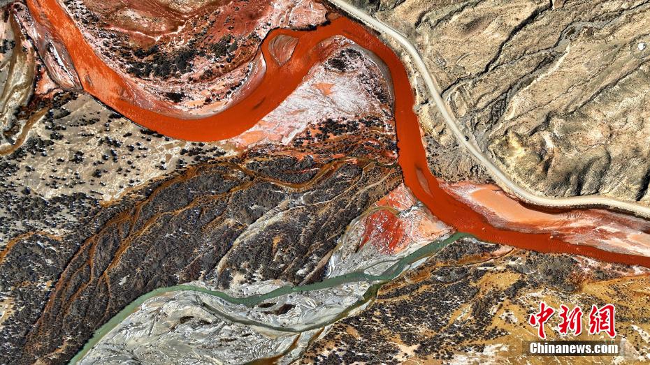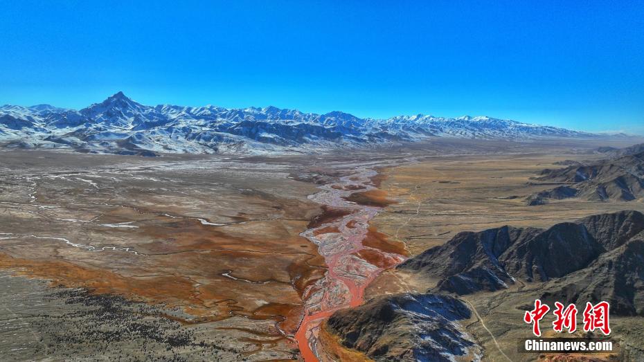 11月寒冬,攝影愛(ài)好者在地處柴達(dá)木盆地的青海省海西蒙古族藏族自治州都蘭縣香日德香加鄉(xiāng),航拍香日德河。鏡頭之下,香日德河河床寬大,水量充沛,因夾帶大量紅色泥沙,使得河水變成了混濁的紅色,當(dāng)?shù)厝罕娙∶小盀跆m烏蘇”,意為紅色的河水。從空中俯瞰,整個(gè)水系似“大地血脈”。