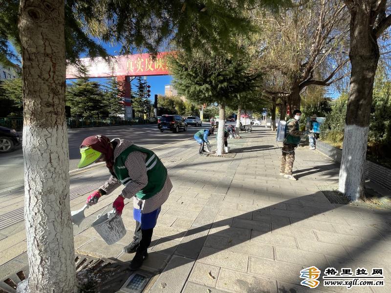 入冬以來,為保障樹木“安全健康”過冬,香格里拉市有關(guān)部門在城區(qū)主次干道、公園、廣場對樹木進行涂白,這是入冬后樹木養(yǎng)護管理的一項措施,可以有效防止樹木遭受蟲害和凍害。圖為綠化工人一手提漆桶、一手拿刷子,在康珠大道將綠化樹主干逐一涂白。( 此里只瑪攝)