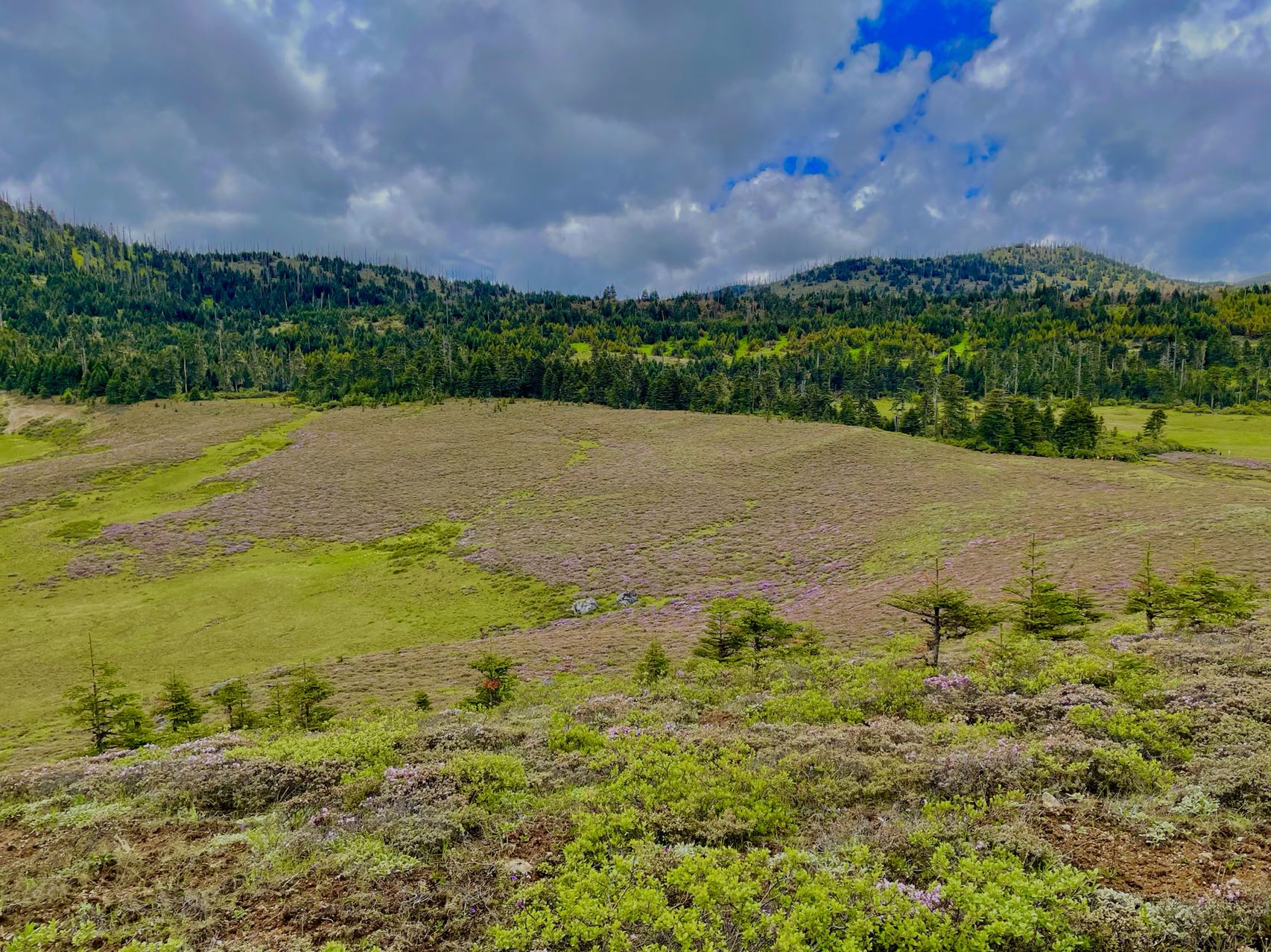 碧沽天池周圍30多平方公里的地方被原始森林覆蓋,樹木高大挺拔,多為云杉和冷杉。還有綠茵茵的牧場、安靜的牛羊群,以及動人心魄的杜鵑花。