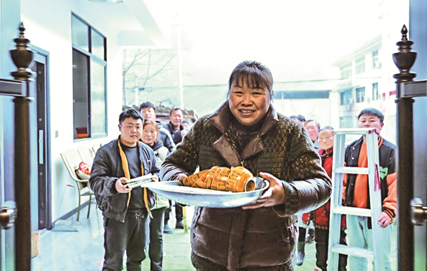 1月10日早上8點(diǎn),冷磧鎮(zhèn)杵坭村劉有蓉一家舉行了簡(jiǎn)單的進(jìn)門(mén)儀式,隨著一聲“吉時(shí)已到,開(kāi)財(cái)門(mén)!”親朋好友手上拿著米油、柴、甘蔗、梯子、盆栽等寓意美好的物品,嘴上說(shuō)著吉祥話,依次進(jìn)門(mén),為新家增添喜氣。