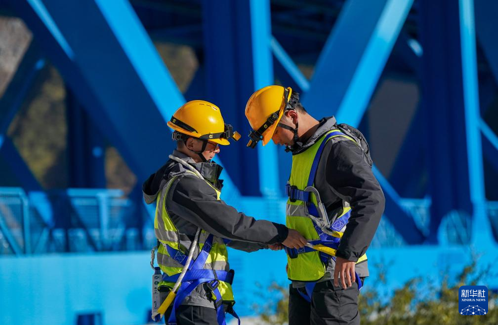 1月24日,工區(qū)班長楊應文(左)在上主纜巡檢前為工友劉榕基檢查安全帶。新華社記者 陳欣波 攝