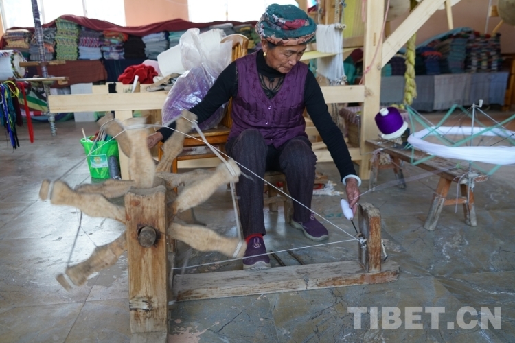 圖為阿七獨(dú)支瑪進(jìn)行手工紡線
