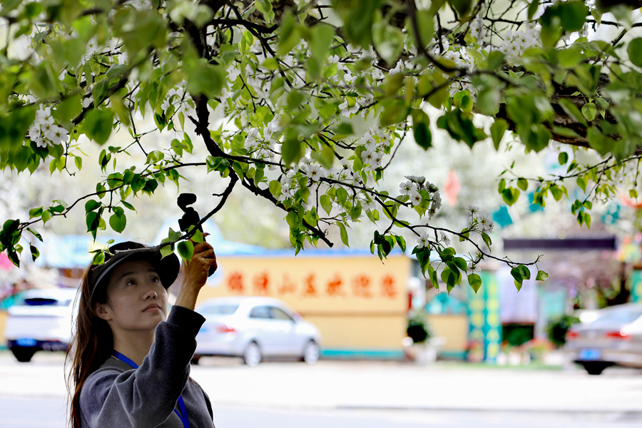 圖為游客在盛開(kāi)的梨花下拍照留念。新華網(wǎng) 黃開(kāi)森 攝