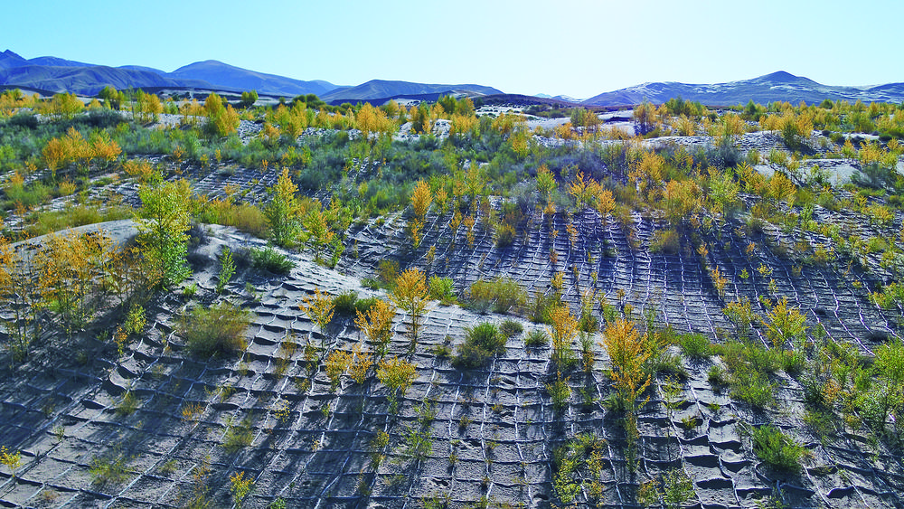“白色方格就是沙障,用尼龍袋裝沙做成連片的方格,用來固沙。這些楊樹是沙地楊樹深栽旱作造林技術成果,選用1.5米左右的青楊苗木,在沙地中深挖1米進行栽植。”