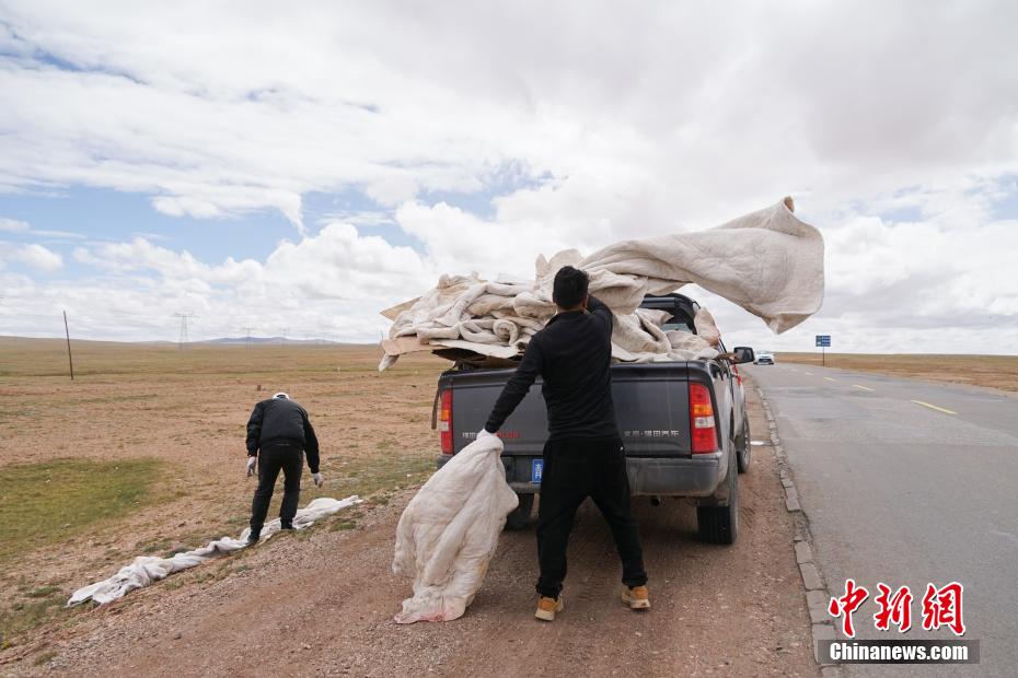 6月20日,三江源國家公園長江源園區(qū)可可西里管理處五道梁保護(hù)站的2名生態(tài)管護(hù)員將青藏公路沿線垃圾撿起裝車。中新社記者 馬銘言 攝