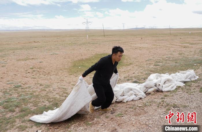 圖為可可西里管理處五道梁保護站生態(tài)管護員德尕在青藏公路沿線收集垃圾。馬銘言 攝