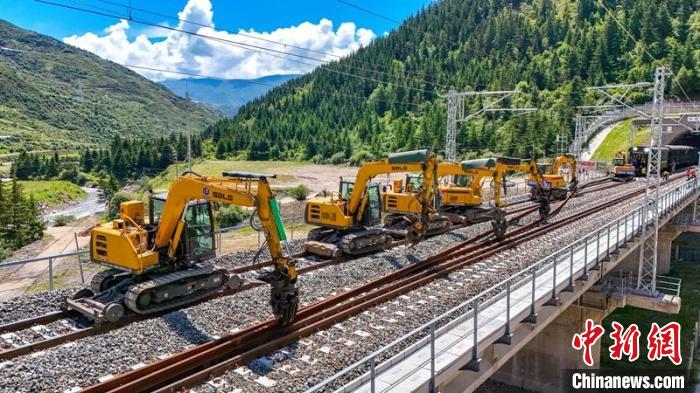 川青鐵路鎮(zhèn)黃段500米長軌鋪設(shè)采用“直鋪法”和“換鋪法”相結(jié)合的方式組織施工,無砟道床采取“直鋪法”施工,有砟道床采取“換鋪法”施工,利用工具軌鋪通右線,作為工程路料運輸主線,同時兼顧左線鋪軌、長軌焊接鎖定及大機搗固穿插施工作業(yè)?!盀榇_保鋪軌安全有序推進,專門配置了HXN5型高原大功率內(nèi)燃機車等80余臺(輛)大型設(shè)備開展軌道施工作業(yè)?!睆埲A稱,期間項目部合理分配資源,5天完成100公里長鋼軌鋪設(shè),12天完成100公里無縫線路單元焊接及放散鎖定工作。
