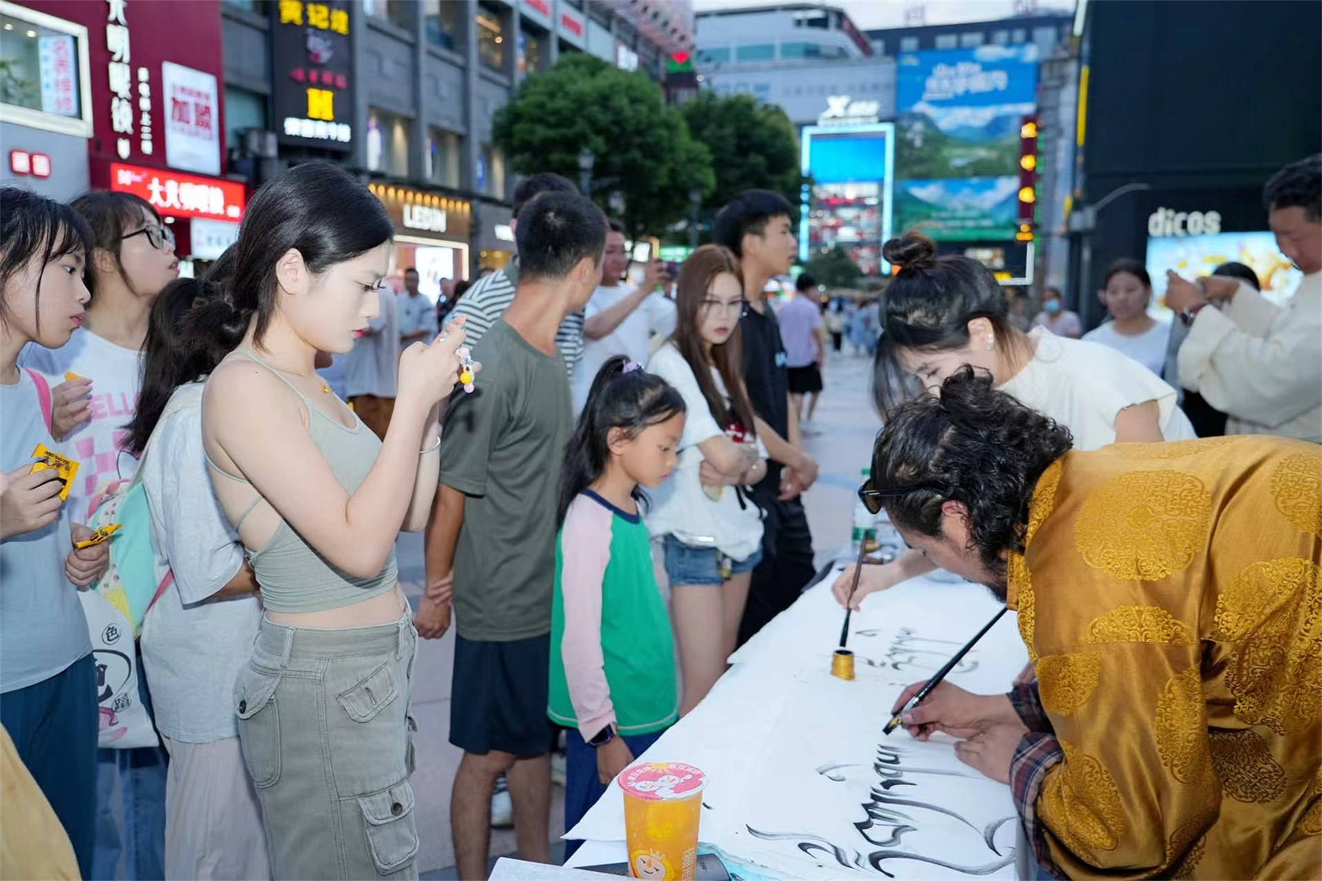 臨近傍晚,在春熙路“丹青繪盛景 筆墨頌祖國”藏文書法展演區(qū),兩位身著藏族傳統(tǒng)服飾的書法老師端坐于案幾之后,他們手持毛筆,蘸取特制的藏墨,在潔白的宣紙上揮灑自如,一筆一劃間流露出濃厚的藏族文化韻味。他們書寫的藏文內容多為吉祥如意的祝福語,每一幅作品都蘊含著對美好生活的向往和對遠方來客的誠摯歡迎。