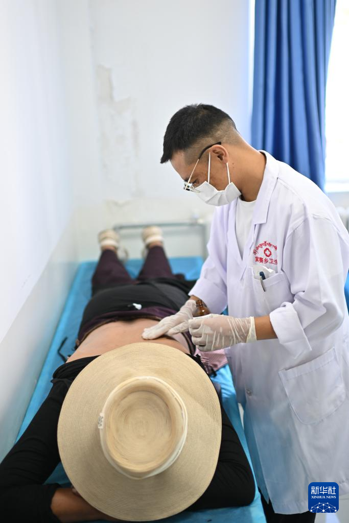 7月31日,青海省果洛藏族自治州達(dá)日縣窩賽鄉(xiāng)衛(wèi)生院醫(yī)生夏吾南加在為患者進(jìn)行藏醫(yī)理療。新華社記者 張龍 攝