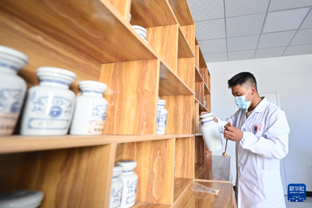 7月31日,青海省果洛藏族自治州達(dá)日縣窩賽鄉(xiāng)衛(wèi)生院醫(yī)生華多在為患者配藏藥。新華社記者 張龍 攝
