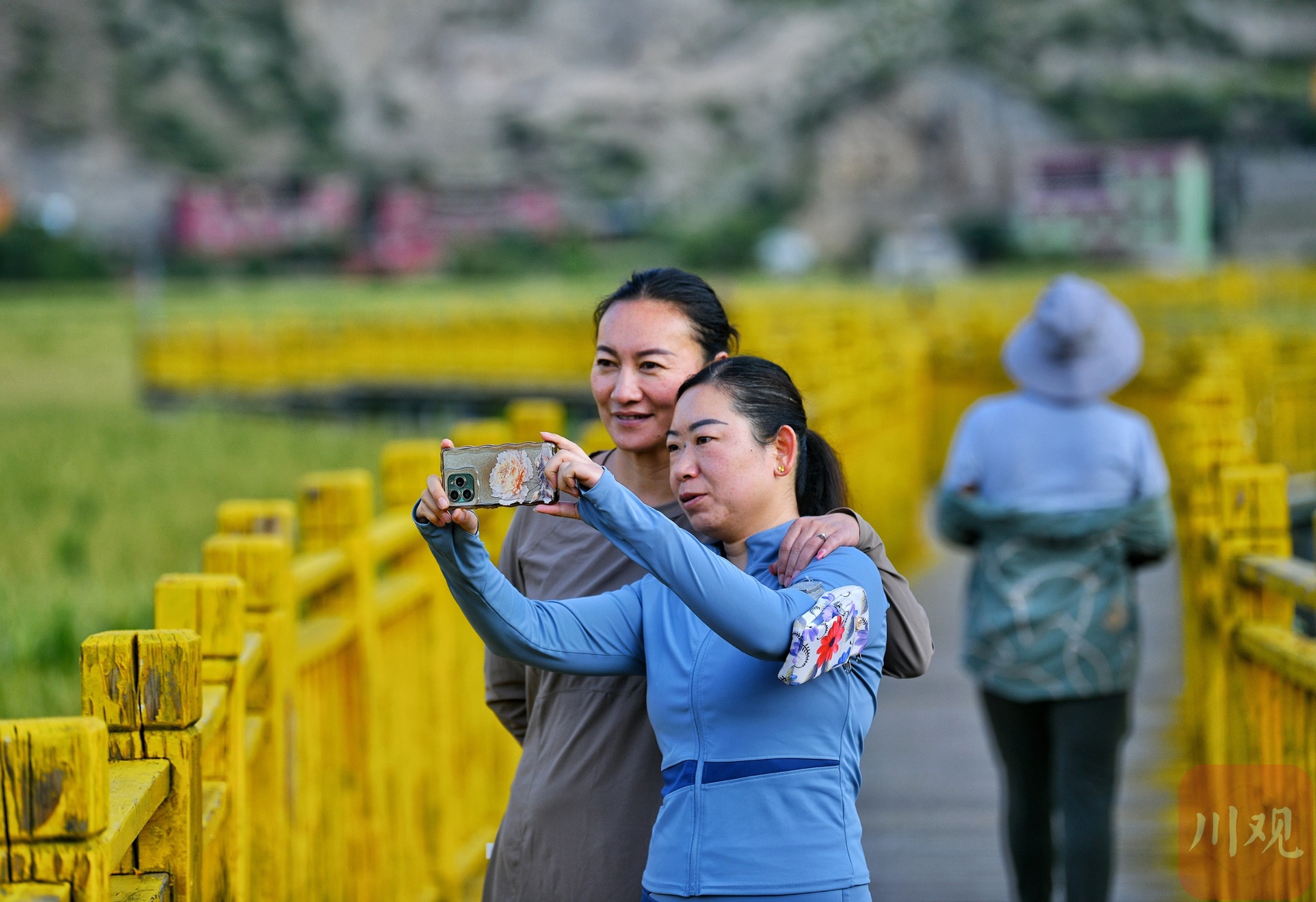 據(jù)了解,“田園棧道”是巴塘縣在農(nóng)旅結合、觀光農(nóng)業(yè)方面作為亮點打造的特色景點,現(xiàn)如今是網(wǎng)紅地,不少自駕游的旅行者都會慕名前來田園棧道打卡。吸引的不止是游客,當?shù)鼐用褚蚕矚g早晚來這里漫步??吹接浾咴谂恼?,棧道上晨練的當?shù)厝诵χ垼骸斑@里漂亮吧,每天都有像您這樣的人拿著相機來拍照,拍完就走一圈,走棧道一圈只需要2500步?!?/p>