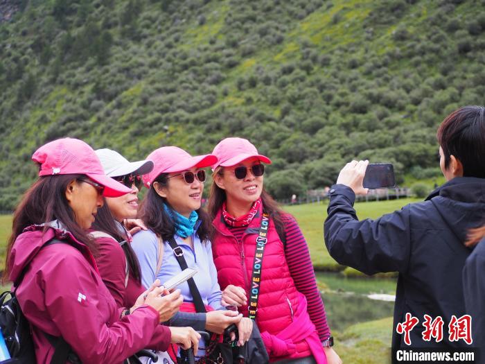 身穿沖鋒衣,腳踩徒步鞋,頭戴運動帽,四位來自臺灣的觀光客7日上午行走在四川省甘孜藏族自治州稻城亞丁景區(qū)內,她們的臉上洋溢著笑容,不時停下和遠處的央邁勇雪山合影。