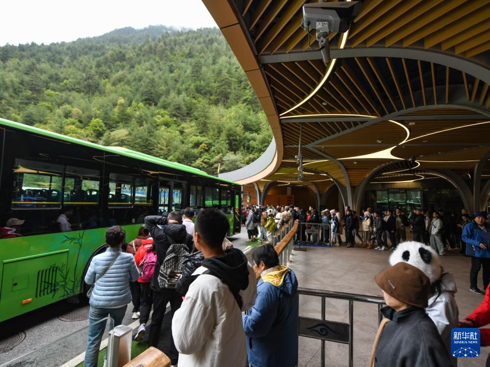 10月9日,游客在黃龍九寨站外乘坐通往景區(qū)的接駁車(chē)。新華社記者 王曦 攝