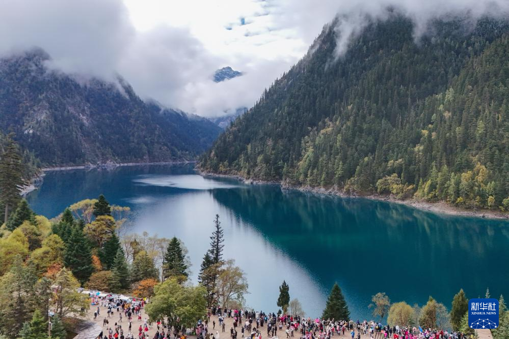 10月10日,游客在九寨溝景區(qū)長(zhǎng)海游覽觀光(無(wú)人機(jī)照片)。新華社記者 王曦 攝