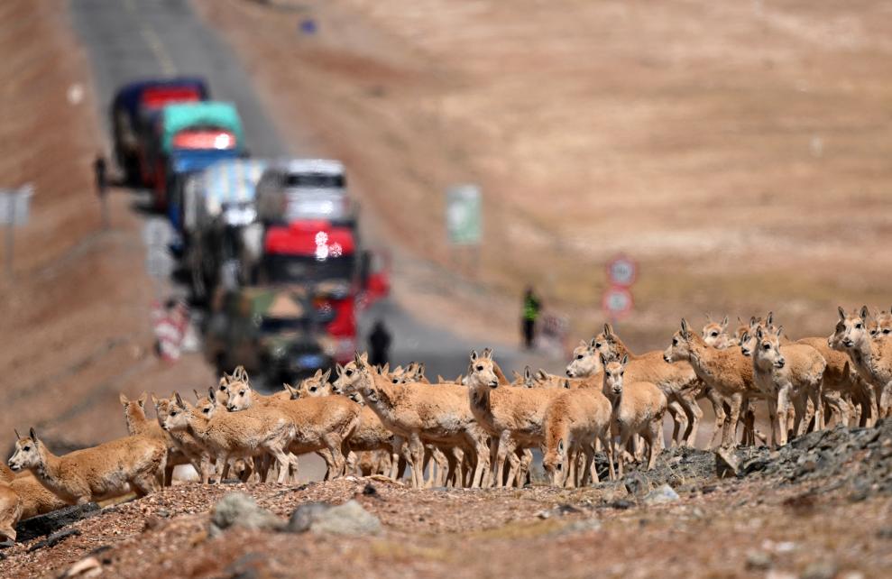 70年過去,青藏公路與可可西里這片土地早已“融為一體”。青藏公路3001、3002公里處,是可可西里藏羚羊遷徙的重要通道。每到藏羚羊遷徙產(chǎn)仔季,在可可西里工作人員的指揮下,來往車輛會在這里自覺排成長龍,在遠處默默等待,為“高原精靈”讓路。