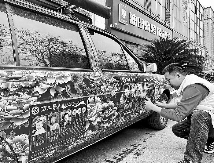 噴水、擦拭、張貼、刮平……馬水峰手持特制刮板,小心翼翼地將幾張尋親貼紙粘貼在車門與車尾附近——