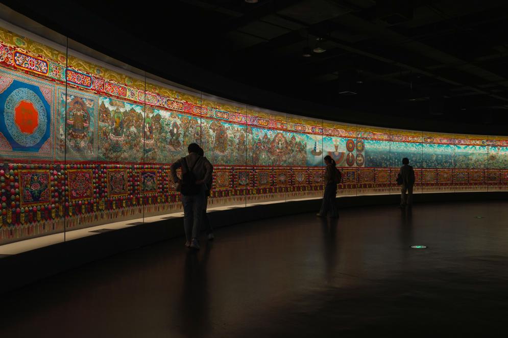 沿著展廳緩緩前行,最令人震撼的莫過(guò)于《中國(guó)藏族文化藝術(shù)彩繪大觀》。講解員溫得兄停在一幅描繪神話傳說(shuō)的畫(huà)面前介紹:“這幅作品由青、藏、甘、川、滇五省區(qū)400位唐卡畫(huà)師共同完成,僅上卷創(chuàng)作就歷時(shí)27年。”今年4月,全長(zhǎng)410米的彩繪大觀下卷布展完成,目前正在博物館北館特展展出。