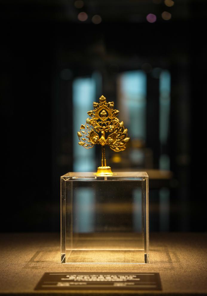 圖為青海藏醫(yī)藥文化博物館展出的嵌松石立鳳金頭飾。新華社記者 杜笑微 攝
