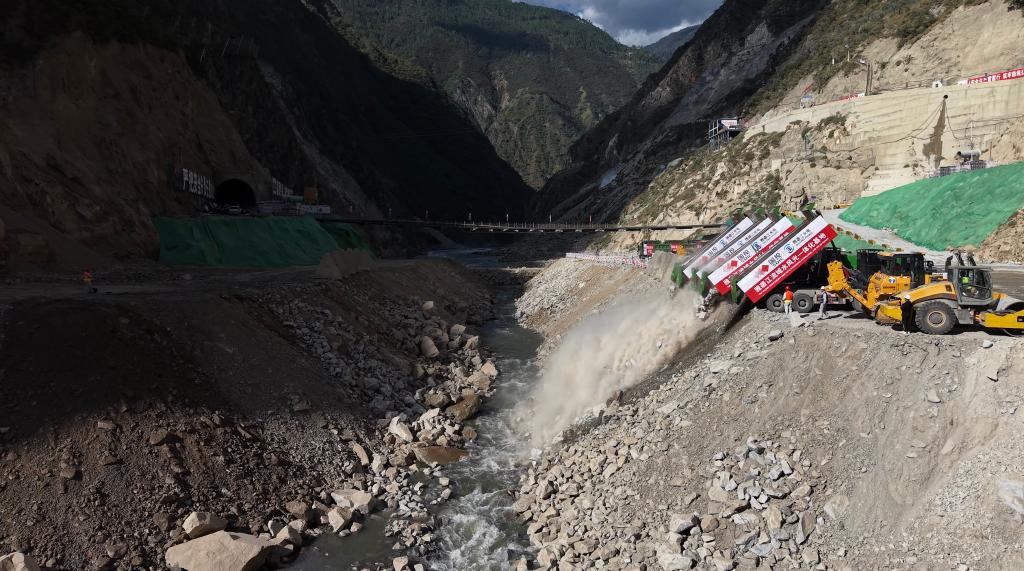 10月28日,自卸卡車(chē)將石料傾倒入孟底溝水電站龍口位置。(雅礱江流域水電開(kāi)發(fā)有限公司供圖)